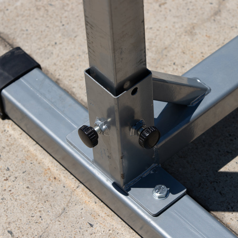 Built with 50mm x 50mm steel tubing and a 25kg high-stability base, this stand ensures durability and safety during use. The large 100mm double-bearing wheels make transport easy, and the included net means it’s ready for play. Total weight: 42.5kg.
